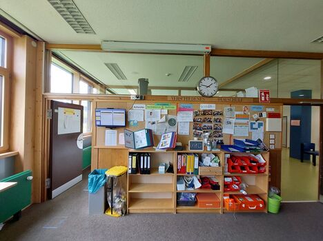 Im Lehrkräfteraum intergriert ist ein Bereich mit Ruhe-Arbeitsplätze, ferner ist ein Coffee- und Copy-Point angeschlossen. Die Zugänge vom Schulbereich zum Sekretariat, zur Schulleitung und weiterem Besprechnungsraum sind durch Glaselemente hell und freundlich gestaltet.